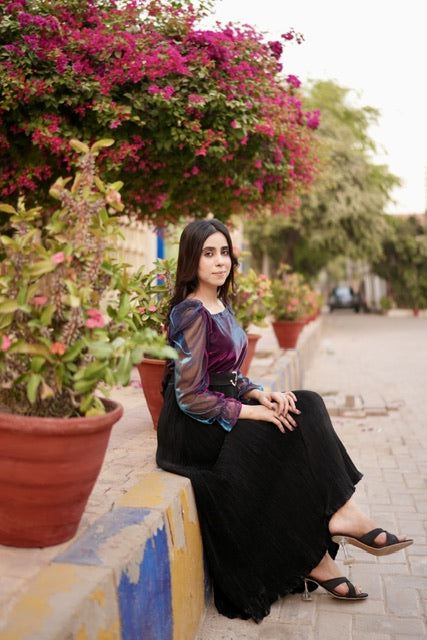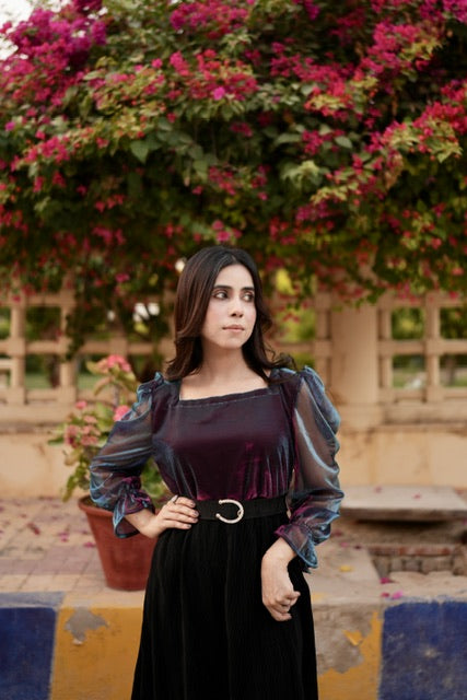 Moonlight bodice, square neckline, full length sleeves, pleated silk flare and a metal belt.