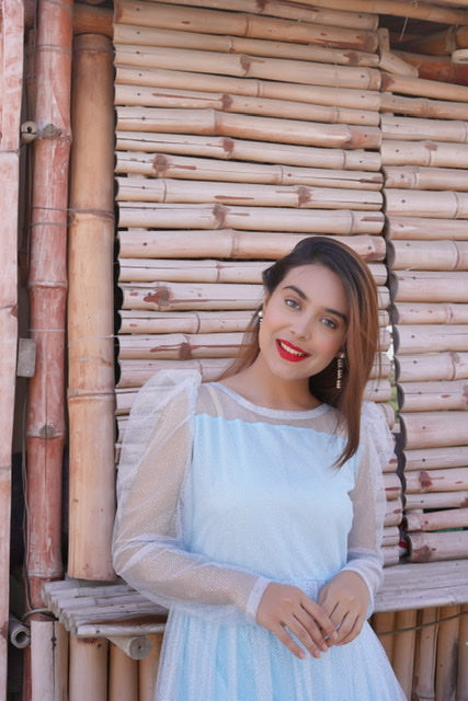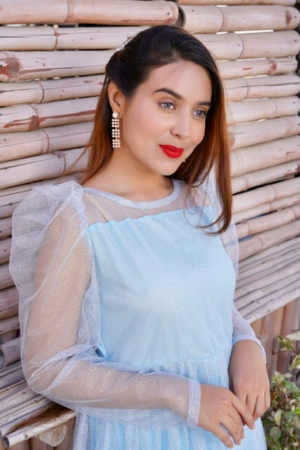 Cinderella is a beautiful net dress with sprinkles of silver and puff sleeves which gives perfect princess vibes. Lining is attached