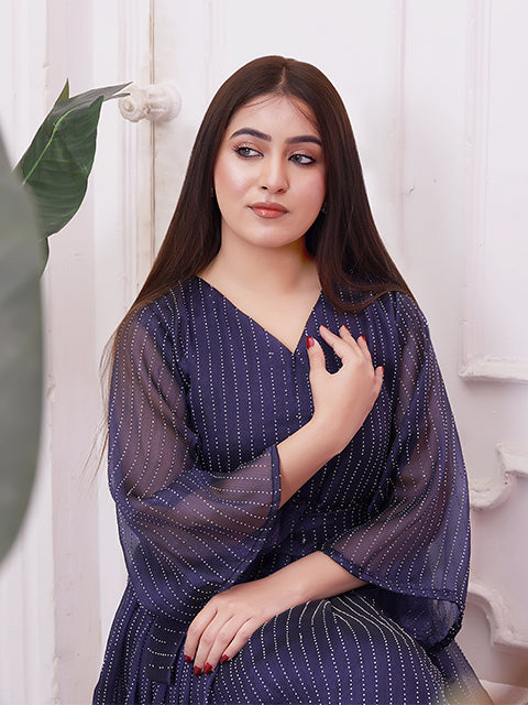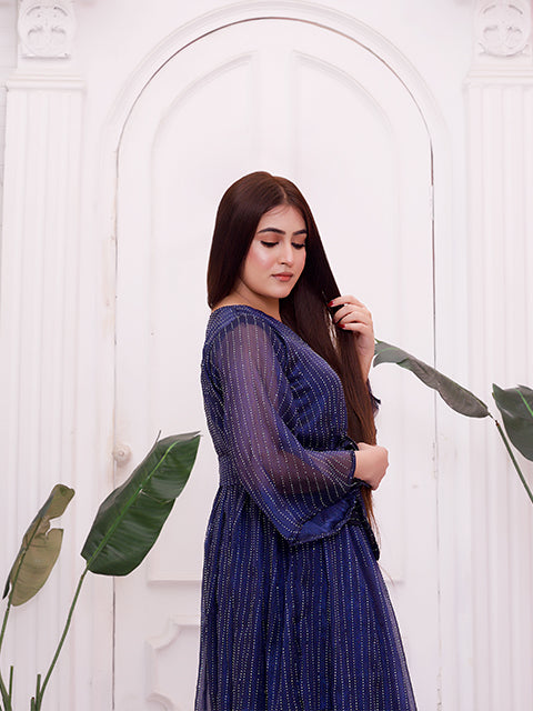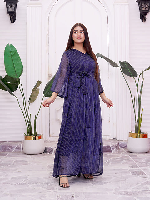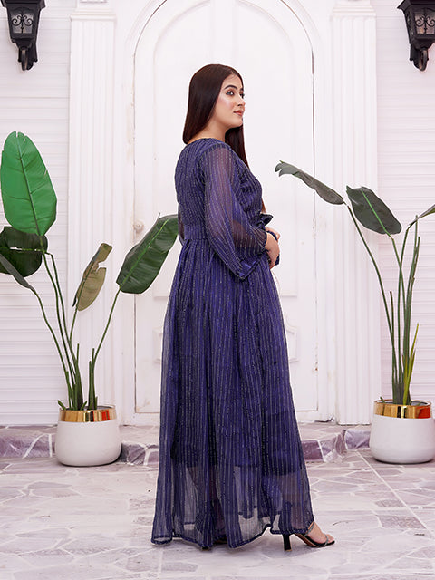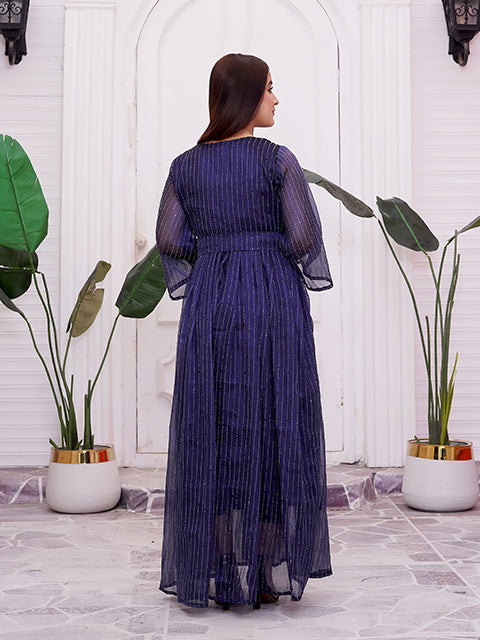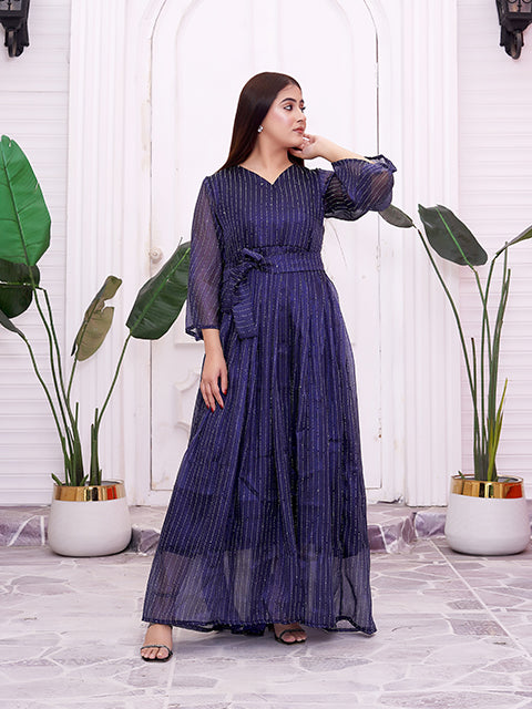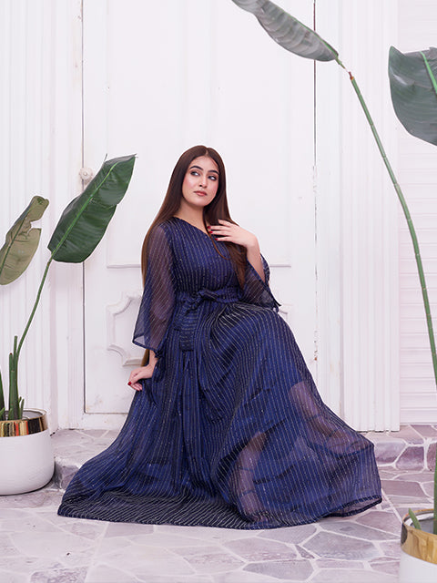 A graceful deep-blue maxi dress highlighted with fine shimmer stripes that add a subtle glow. Designed with a flattering V-neck, waist tie detail, and soft sheer sleeves, it flows beautifully with every step. A perfect choice for evening events, festive occasions, or elegant celebrations.