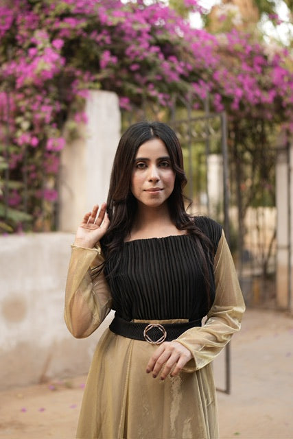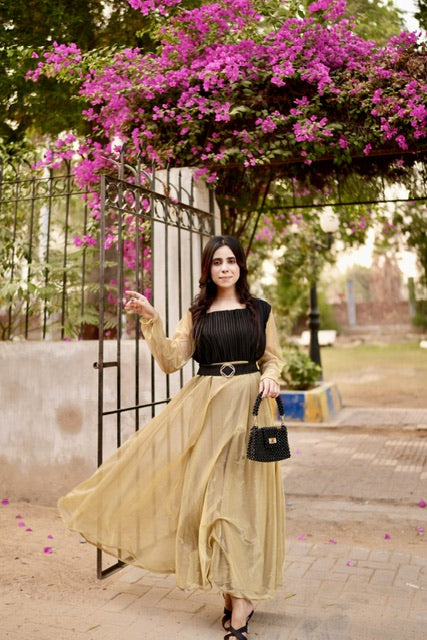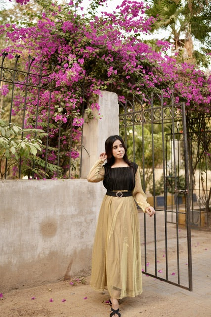 Square neckline, black pleated bodice, gold moonlight flare and metal belt to adjust.