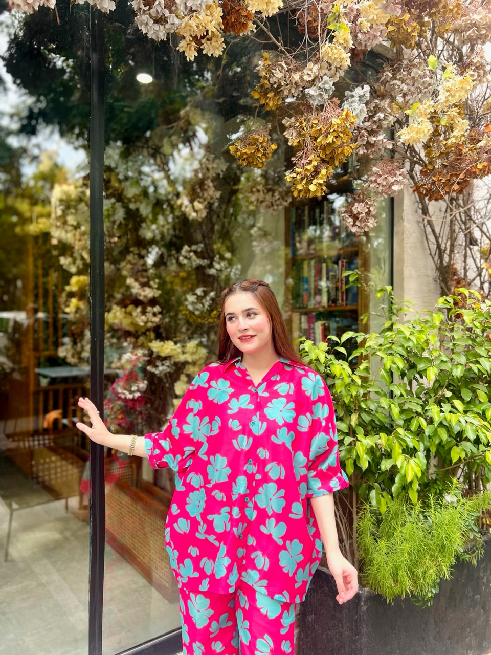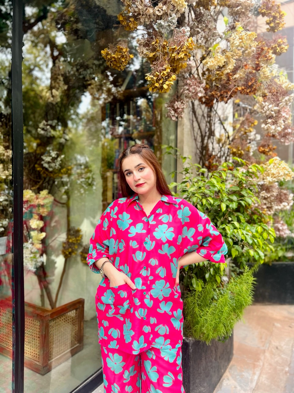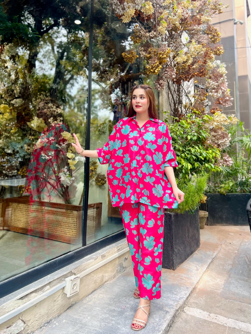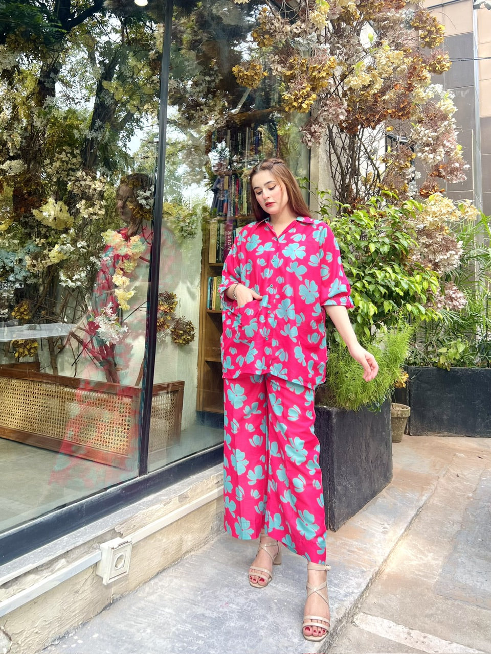 Get ready to turn heads in this playful floral printed button down co-ord set!