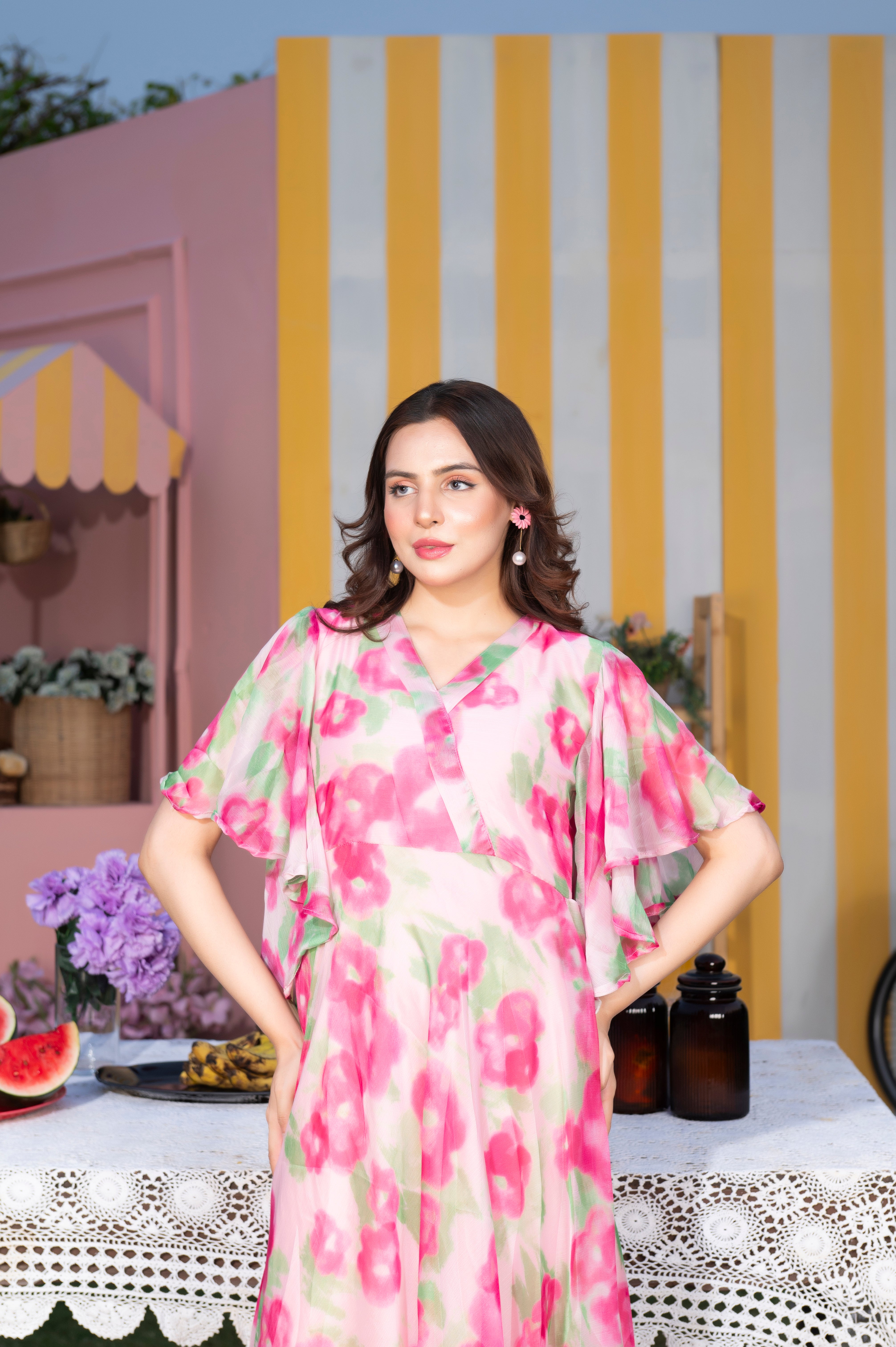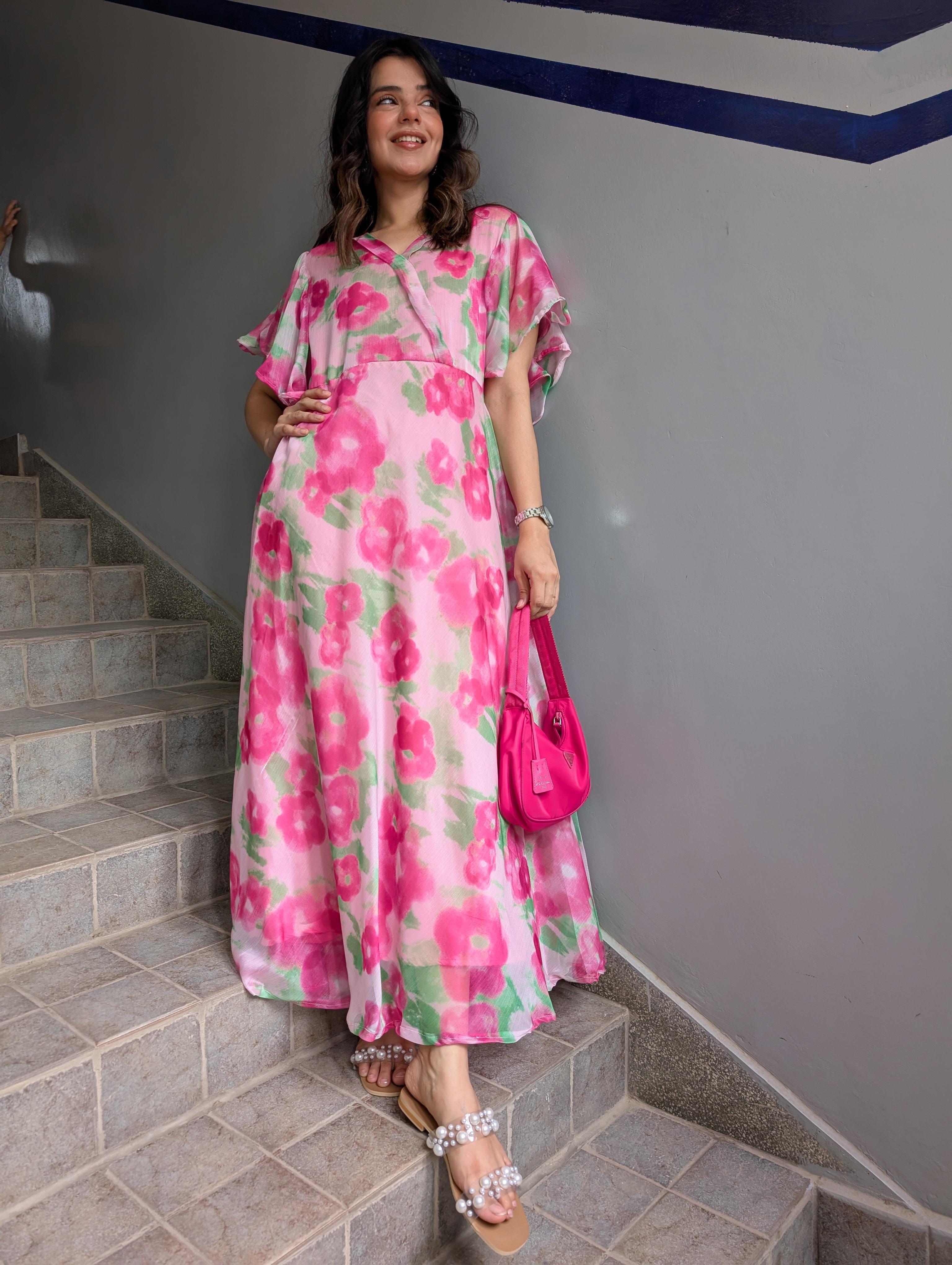 It beautifully captures the romantic and airy feel of the dress, with its flowy silhouette and watercolor-style floral print.