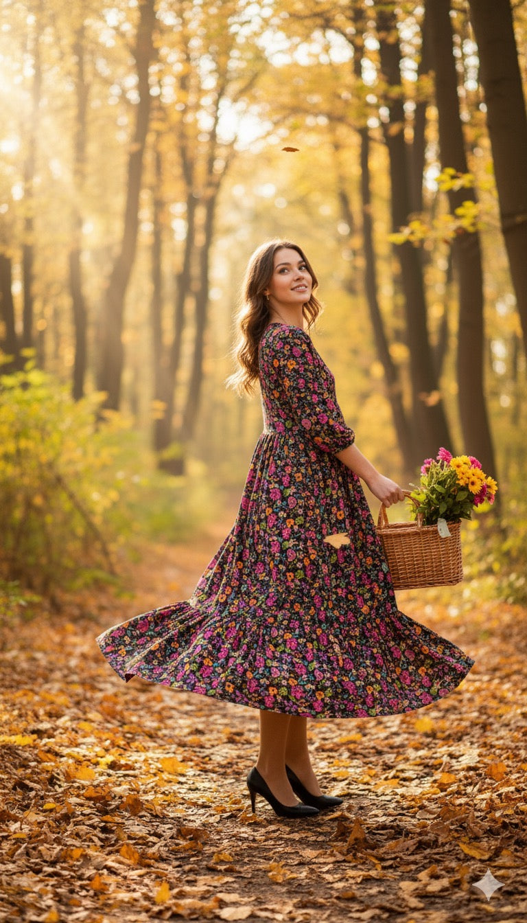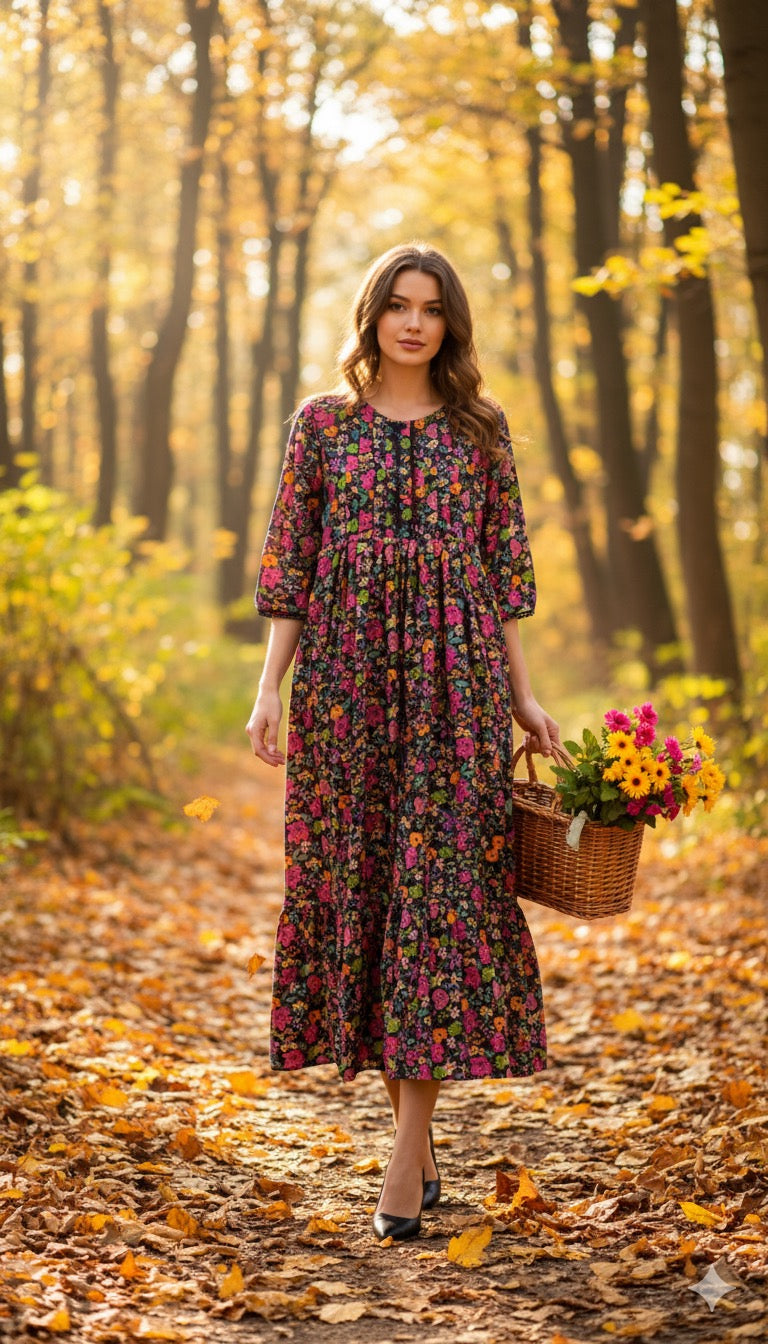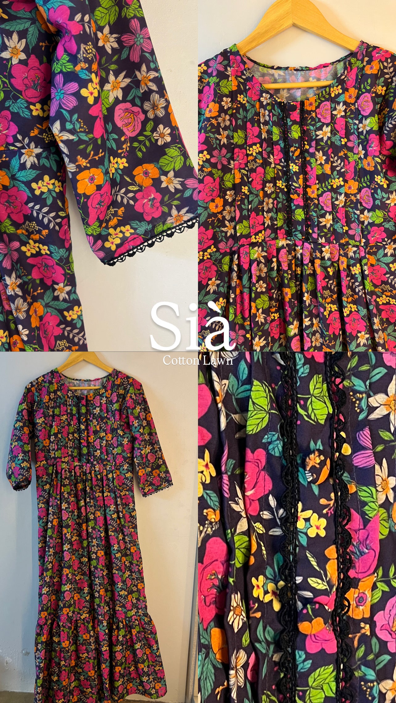 Printed floral frock with tiers and lace details. Same print buttons on the bodice