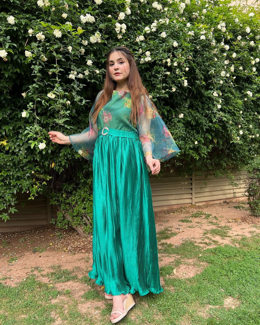 Printed Organza, Sweetheart neckline, butterfly sleeves, pleated silk flare with metal belt.