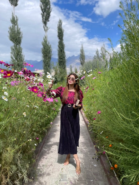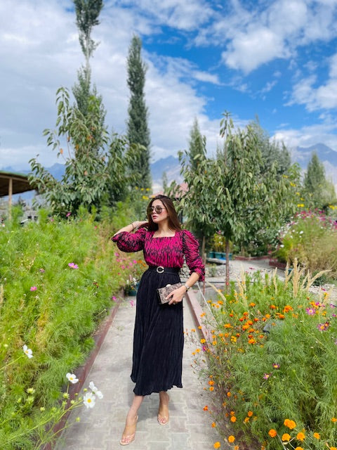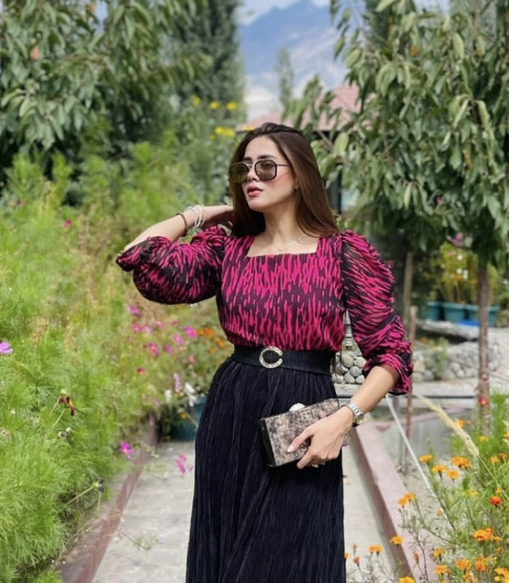 Chiffon bodice, square neckline, frill sleeves, pleated silk fitted flare with matching statement belt.